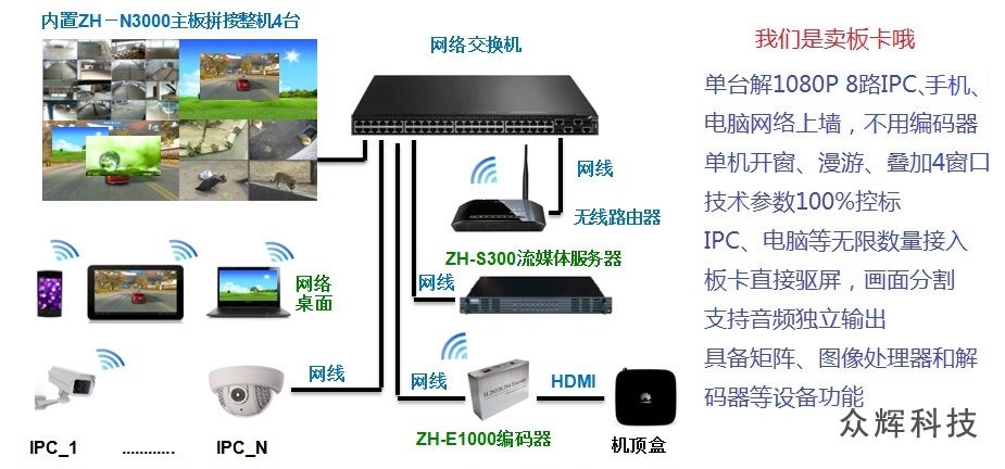 網(wǎng)絡(luò)拼接主板ZH-N3000+網(wǎng)絡(luò)桌面可組成大型網(wǎng)絡(luò)視頻會(huì)議、安防監(jiān)控系統(tǒng)。